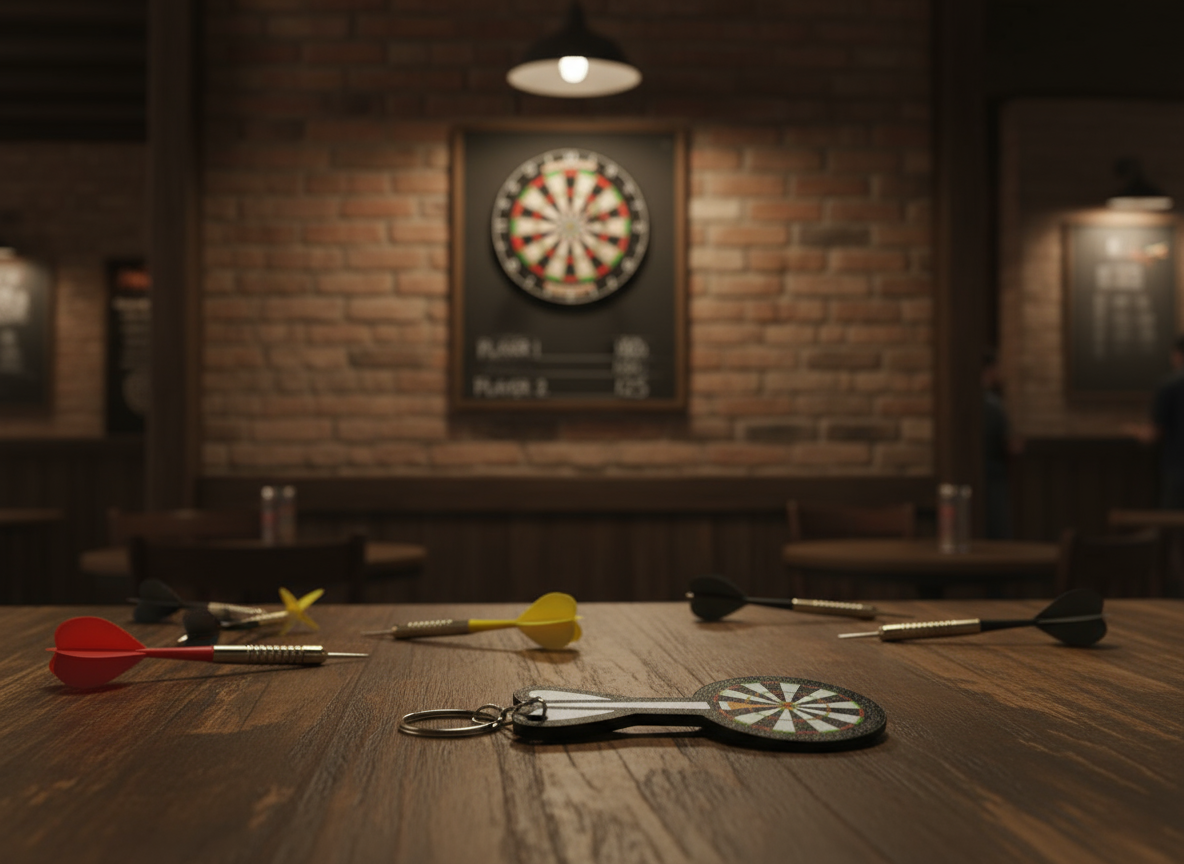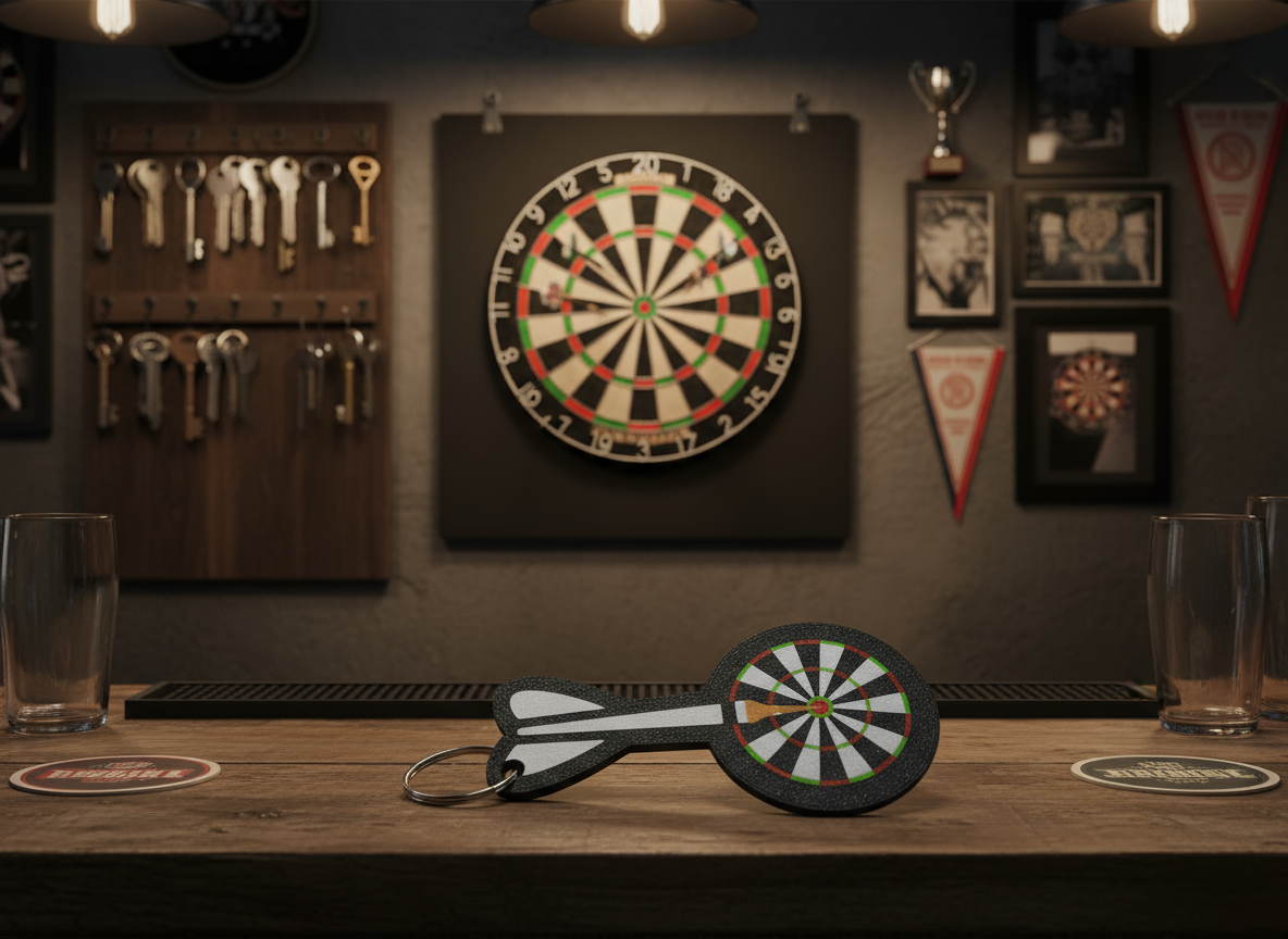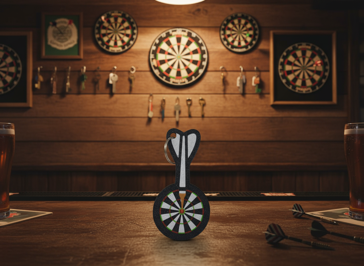 Para os amantes de dardos, este porta-chaves é um verdadeiro símbolo de precisão e diversão! Com um design criativo que combina um dardo e um alvo clássico, esta peça é perfeita para quem quer levar a paixão pelo jogo para todo o lado.